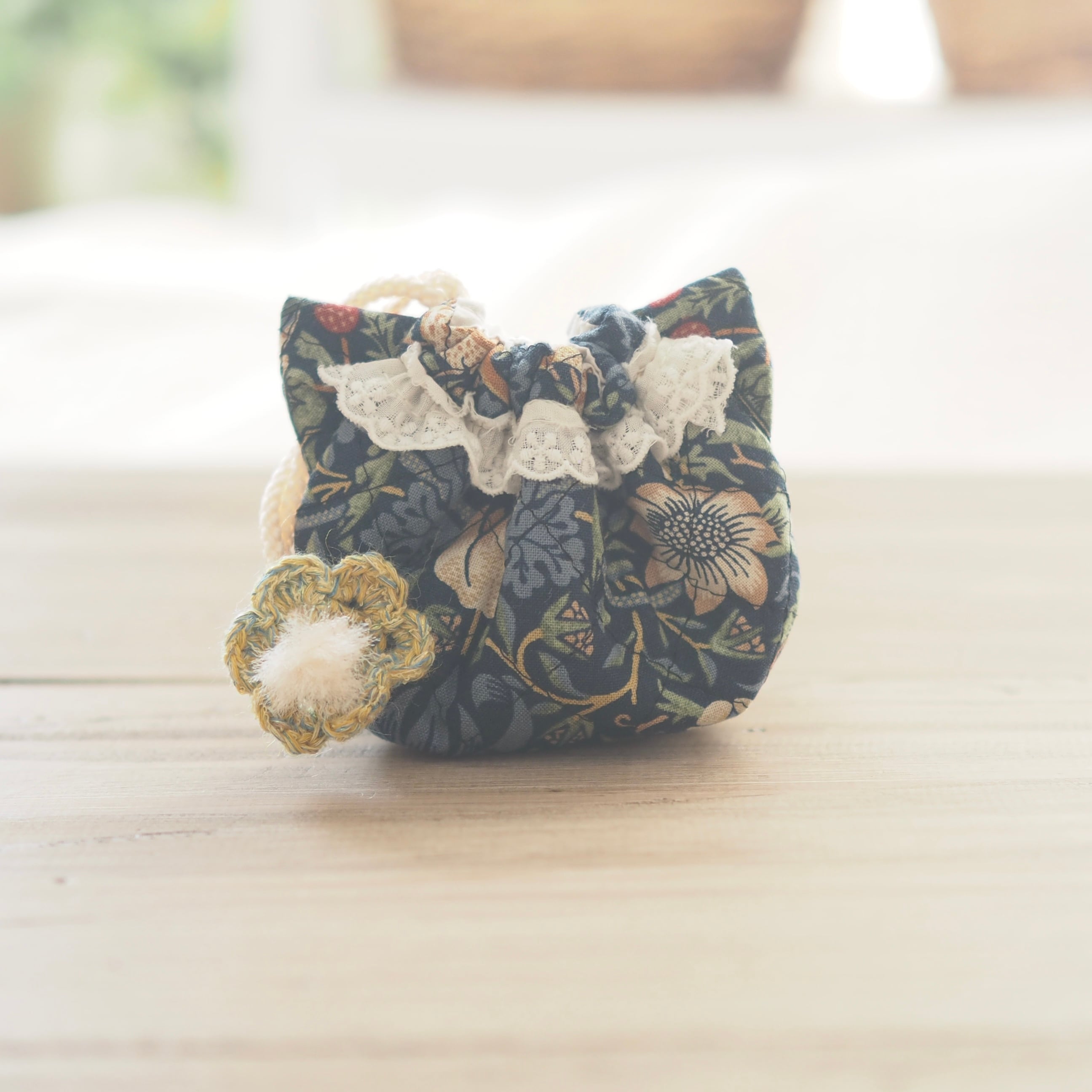 ・紐先:一つひとつ手編みした、かぎ針編みのお花モチーフ(色ランダム)