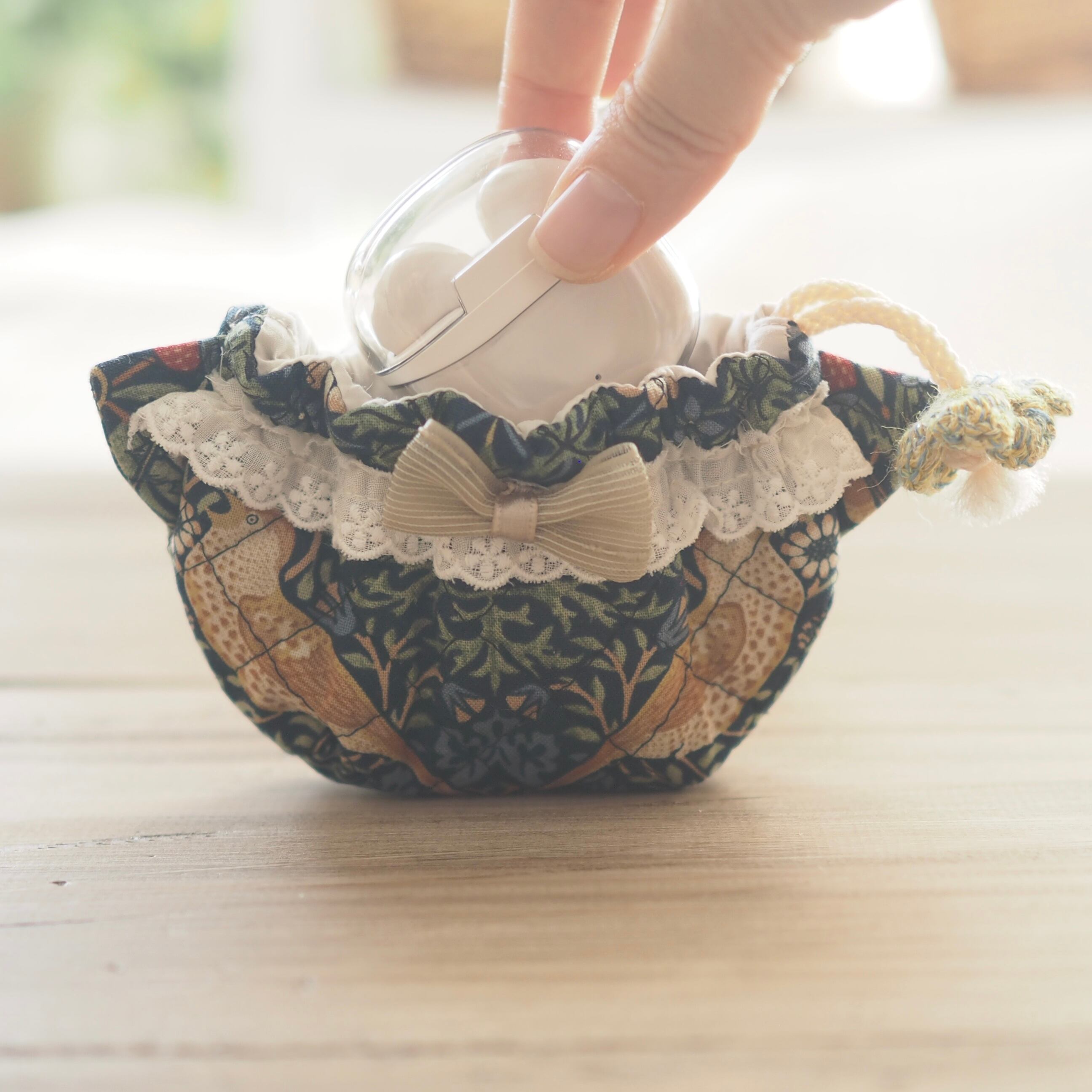 ふっくらとした厚みとやわらかな手ざわりが、クラシカルな美しさを引き立てながら、イヤホンやクリスタル、割れやすいアクセサリーをやさしく守ります。