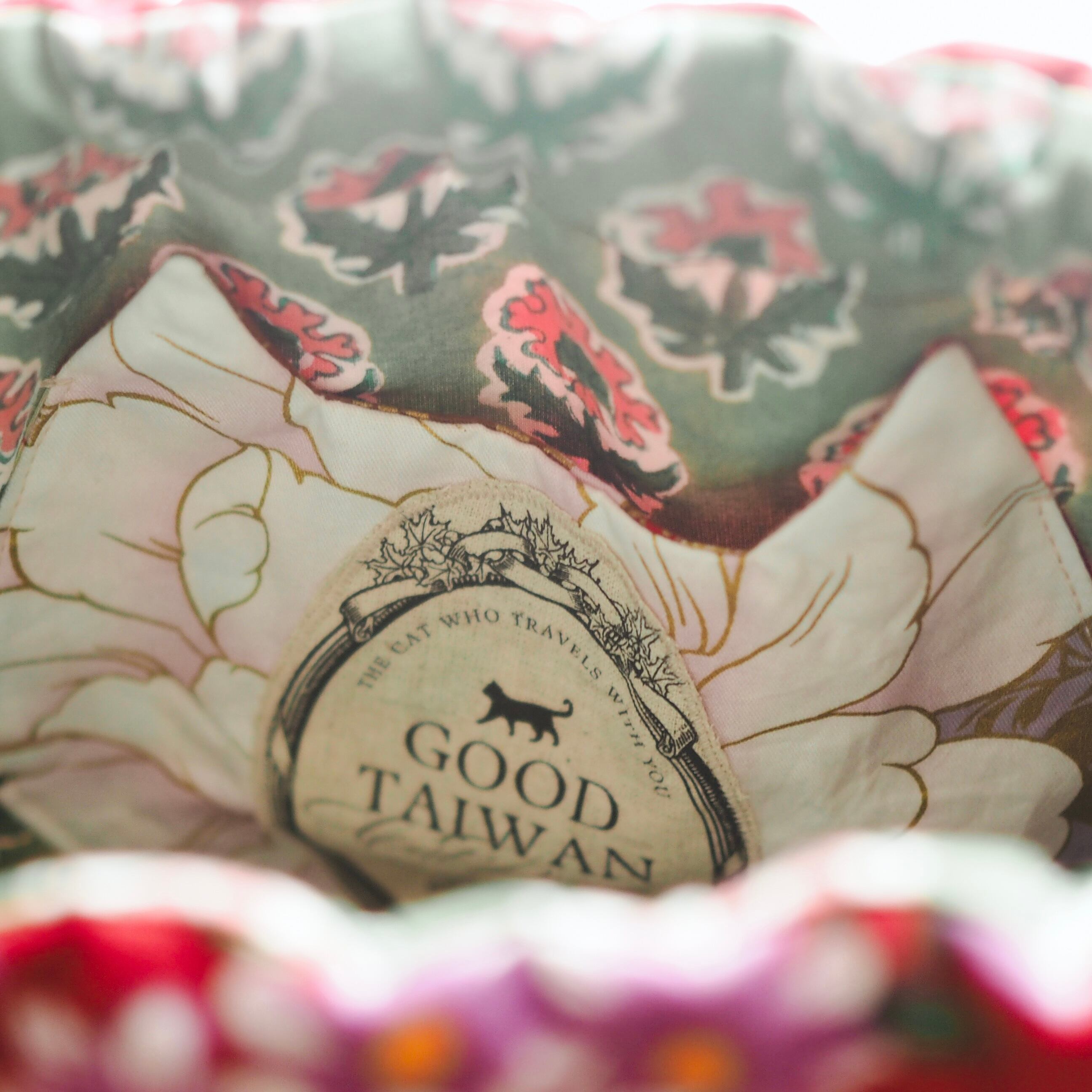 深紅の花布に金襴の耳、そして黒×金のロープが映える姿は、まるで「和のドレス」を纏った小さな猫のよう。