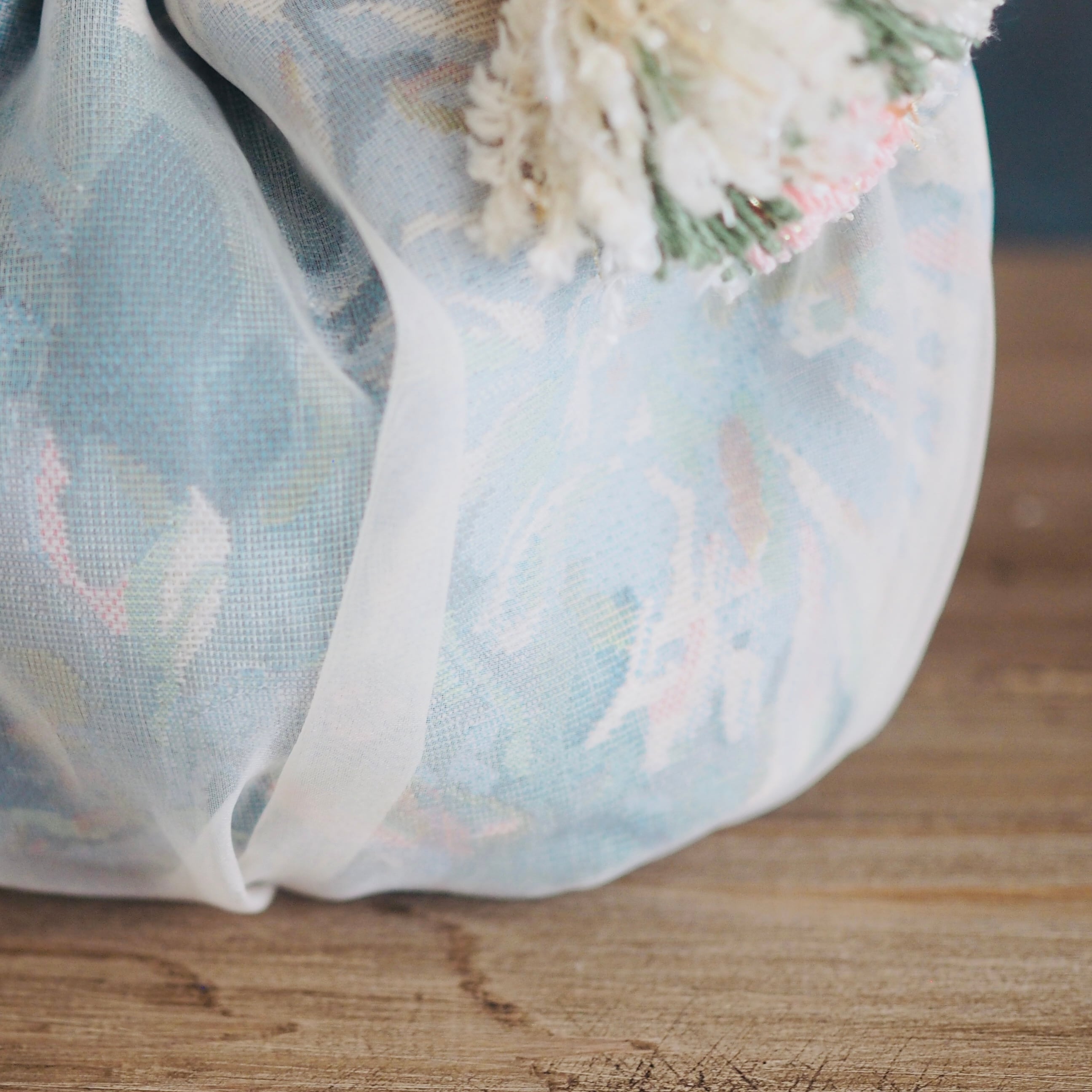 淡いブルーのゴブラン生地に、ふんわりとチュールを重ねて。