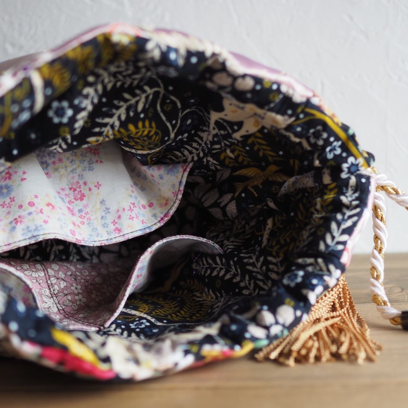 作品名: 台湾花柄x絹織物2way巾着バッグ【鶴華】