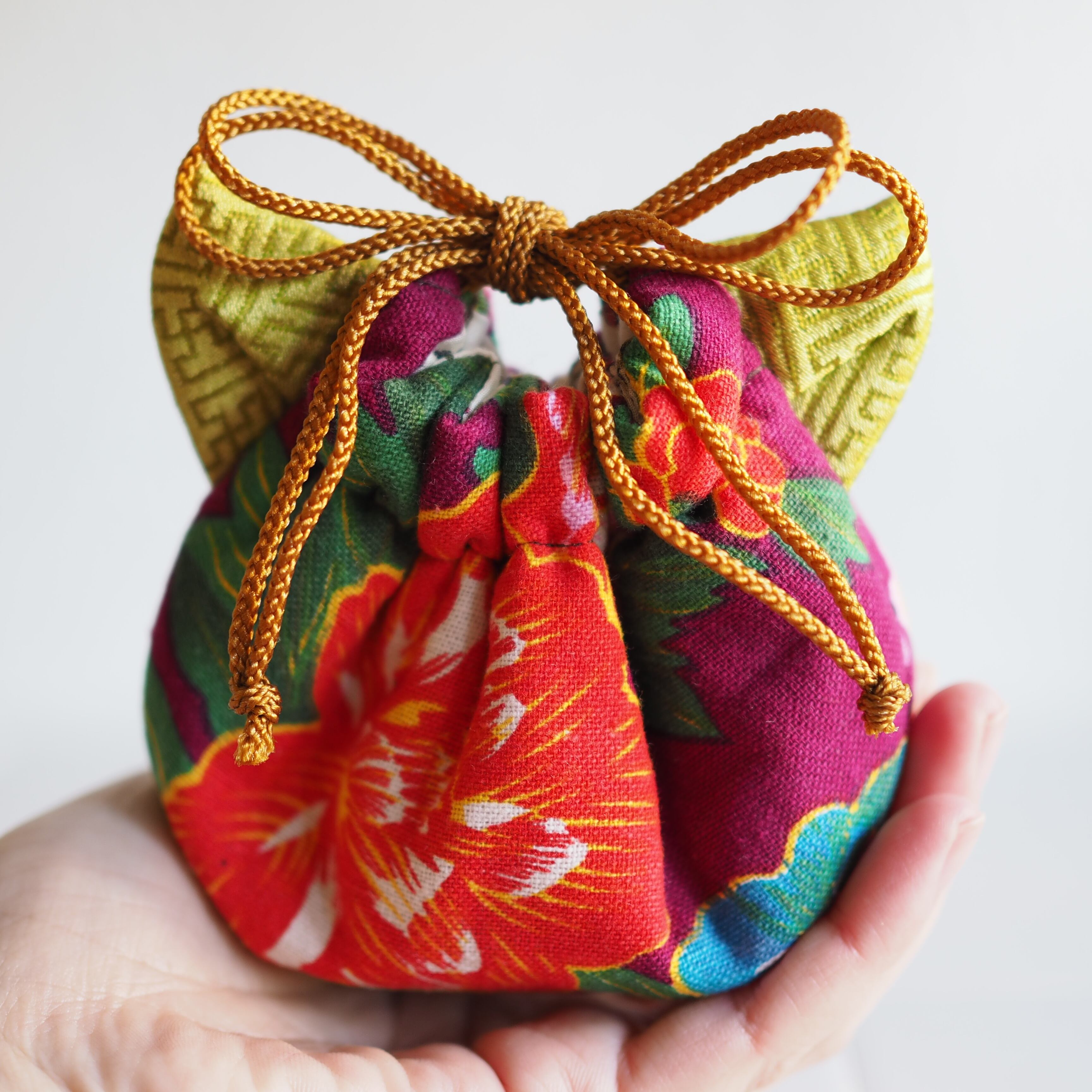 丁度手のひらに収まるミニサイズの巾着ポーチ。みみは本体の花生地に合わせて一番ぴったりな絹織物/金襴織使用、両方キルト芯入り、持ち心地抜群。バッグの中に入れたり、そのままお出かけポーチとして使うのも良いですよ。