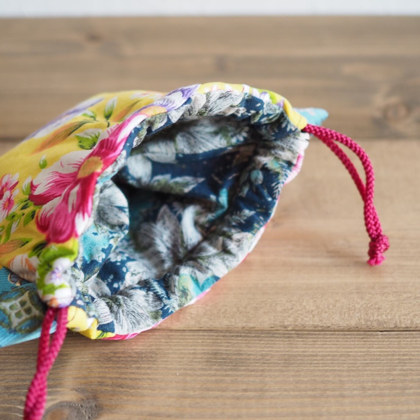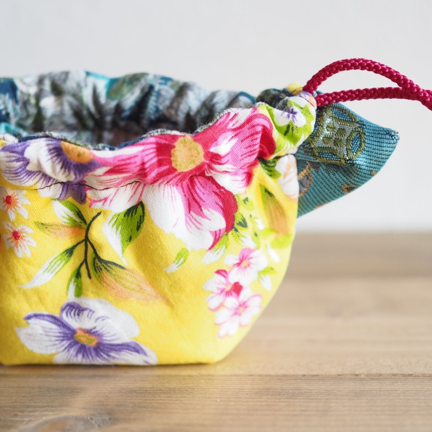 丁度手のひらに収まるミニサイズの巾着ポーチ。みみは本体の花生地に合わせて一番ぴったりな絹織物/金襴織使用、両方キルト芯入り、持ち心地抜群。バッグの中に入れたり、そのままお出かけポーチとして使うのも良いですよ。