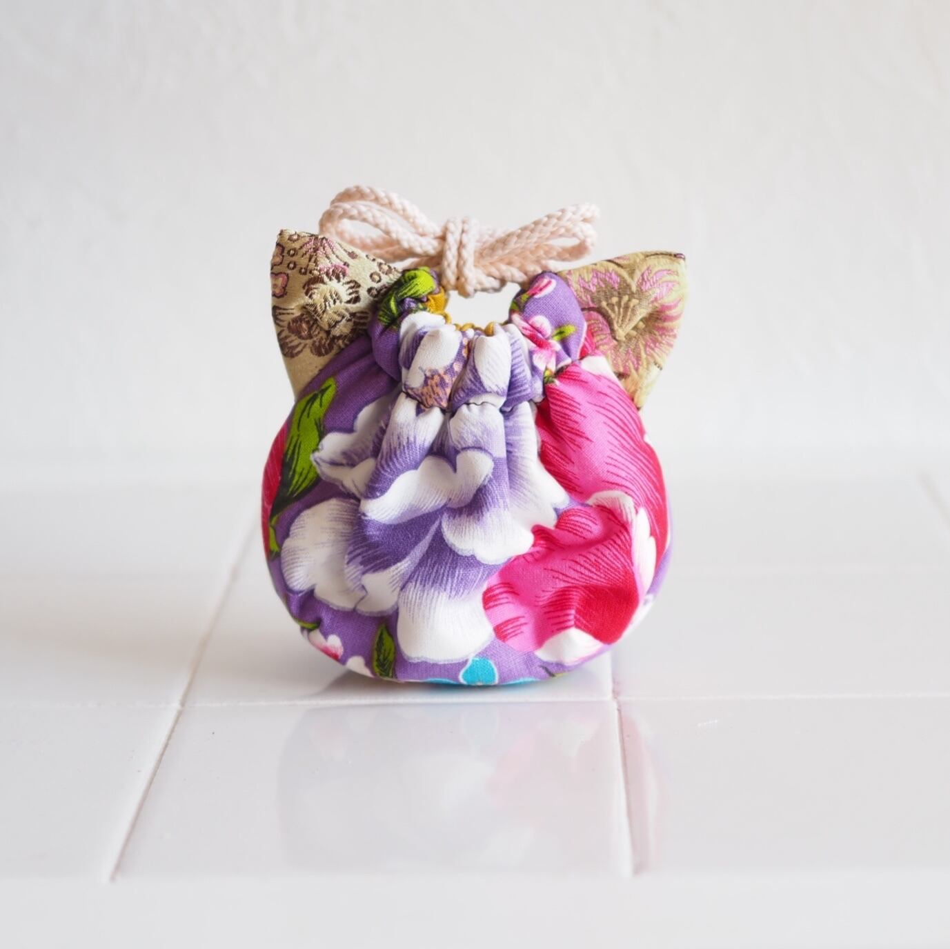 作品名: 猫型の台湾花柄x絹織物mini巾着ポーチ