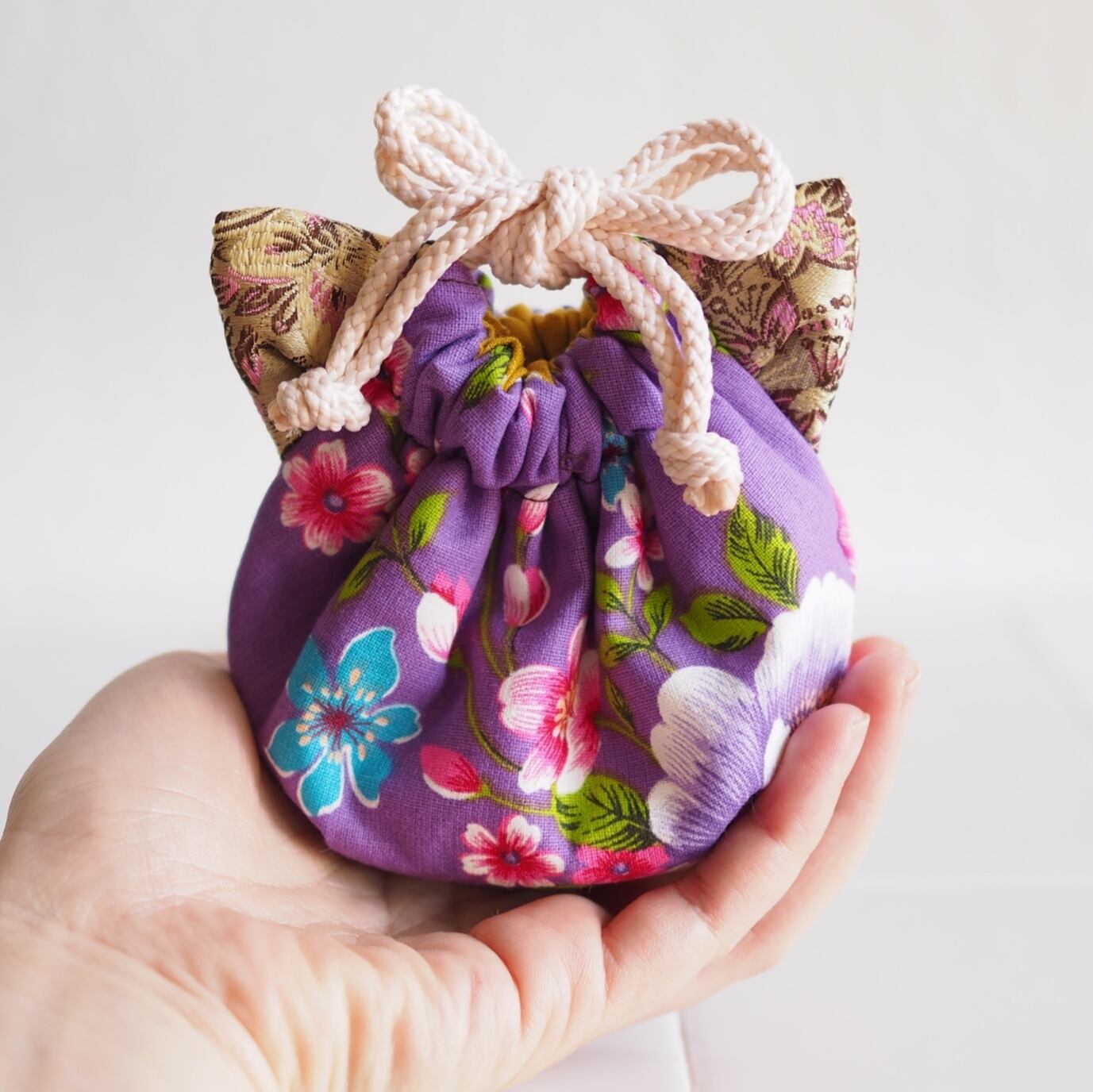 丁度手のひらに収まるミニサイズの巾着ポーチ。みみは本体の花生地に合わせて一番ぴったりな絹織物/金襴織使用、両方キルト芯入り、持ち心地抜群。バッグの中に入れたり、そのままお出かけポーチとして使うのも良いですよ。
