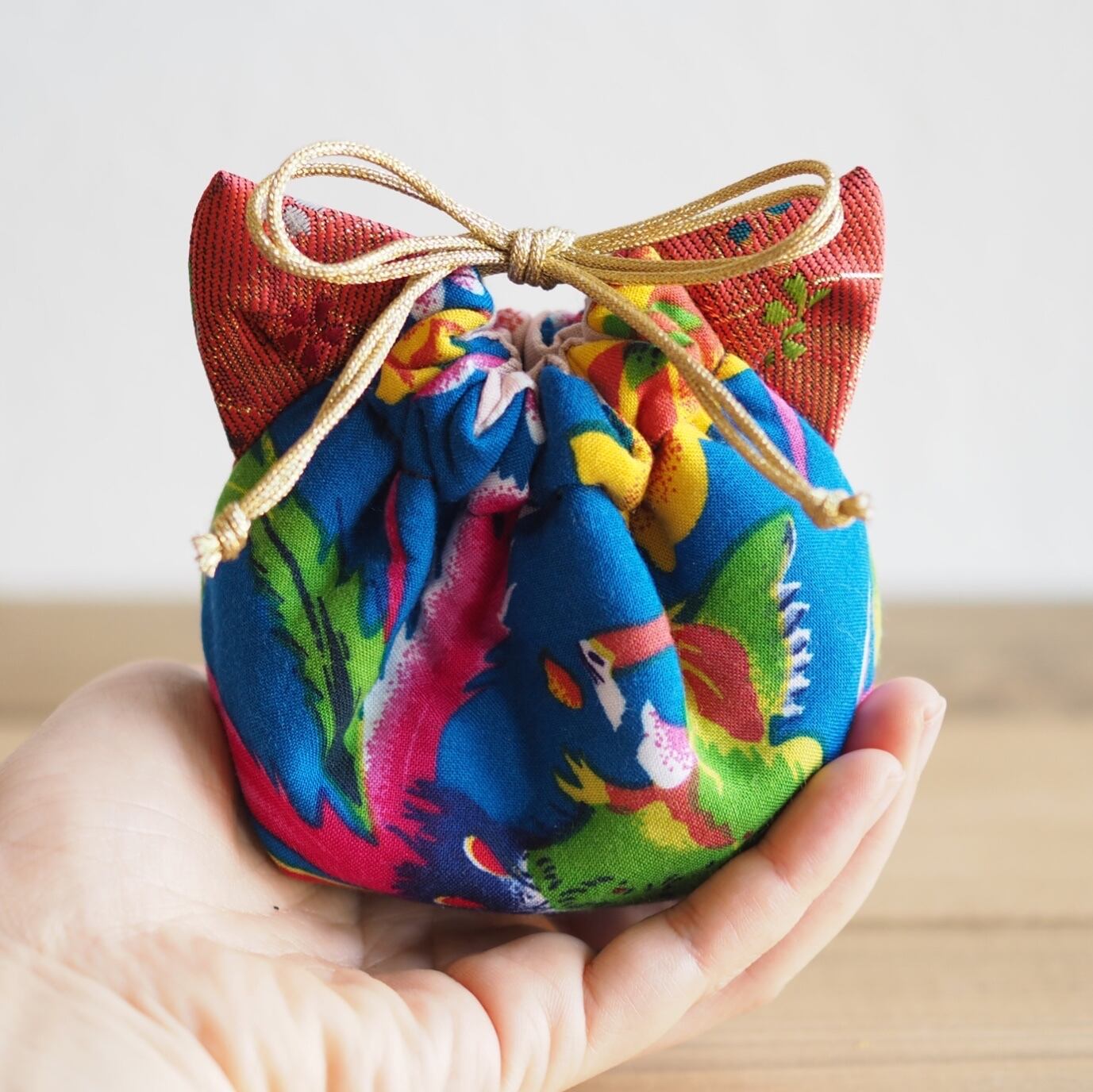 丁度手のひらに収まるミニサイズの巾着ポーチ。みみは本体の花生地に合わせて一番ぴったりな絹織物/金襴織使用、両方キルト芯入り、持ち心地抜群。バッグの中に入れたり、そのままお出かけポーチとして使うのも良いですよ。