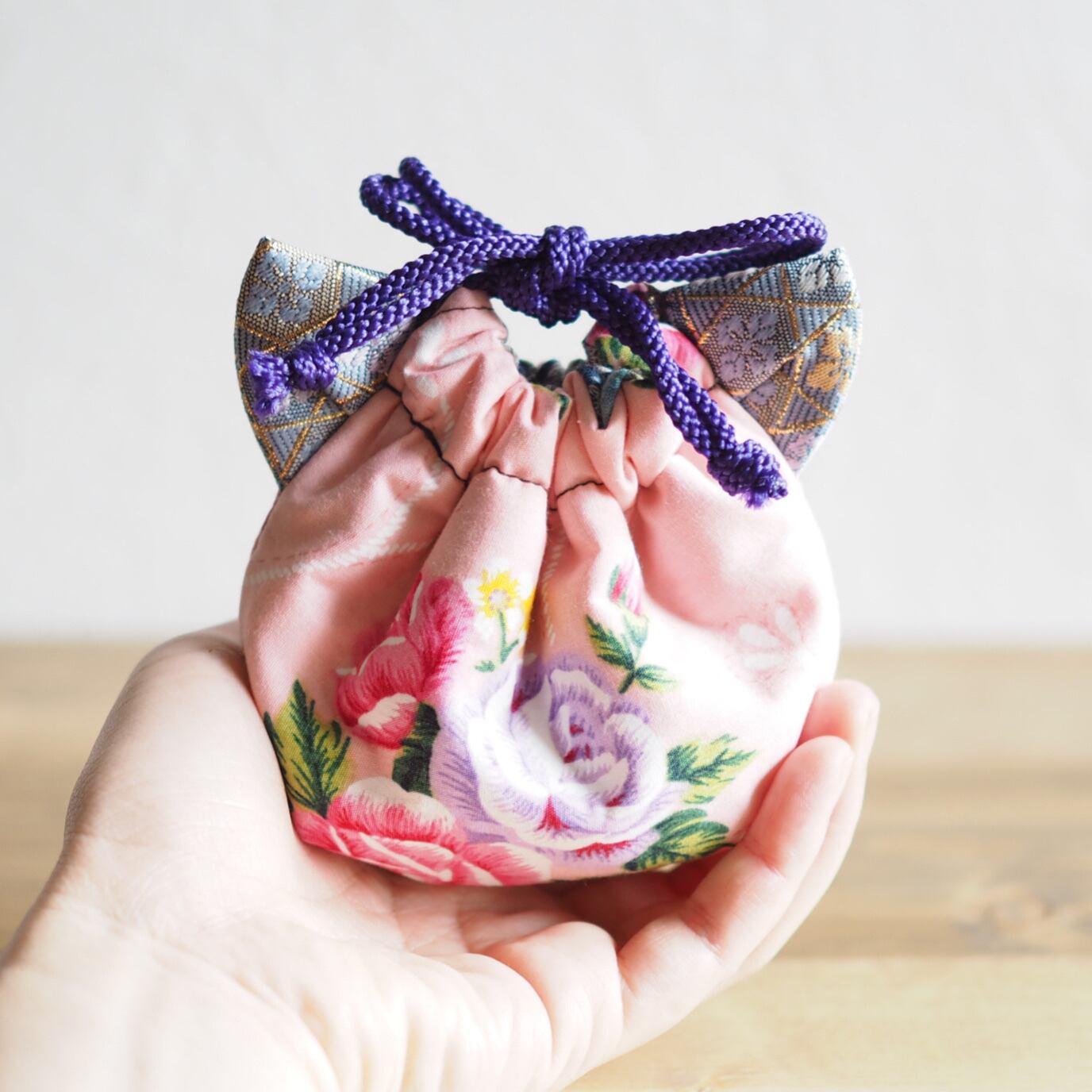 丁度手のひらに収まるミニサイズの巾着ポーチ。みみは本体の花生地に合わせて一番ぴったりな絹織物/金襴織使用、両方キルト芯入り、持ち心地抜群。バッグの中に入れたり、そのままお出かけポーチとして使うのも良いですよ。