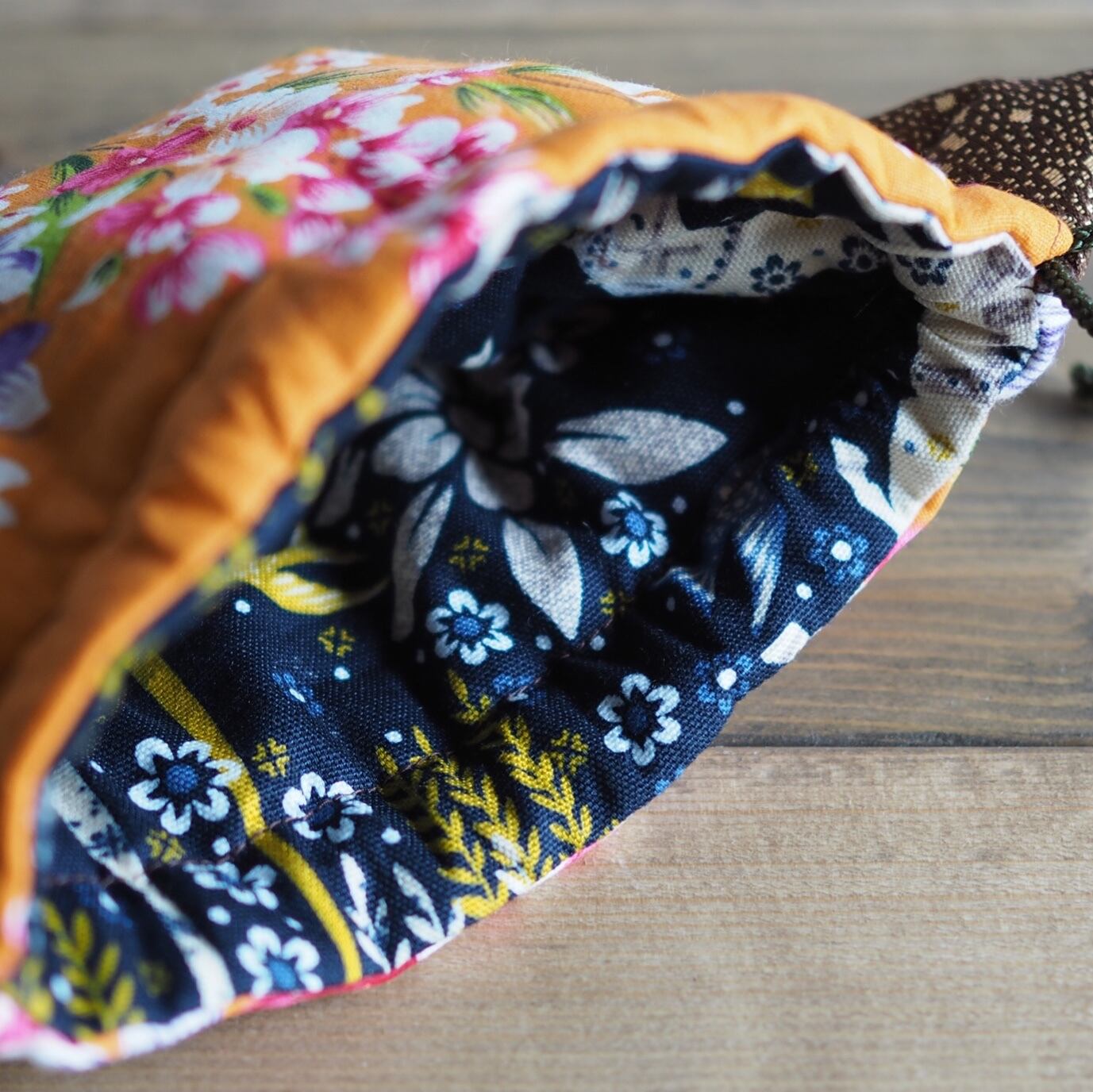 丁度手のひらに収まるミニサイズの巾着ポーチ。みみは本体の花生地に合わせて一番ぴったりな絹織物/金襴織使用、両方キルト芯入り、持ち心地抜群。バッグの中に入れたり、そのままお出かけポーチとして使うのも良いですよ。