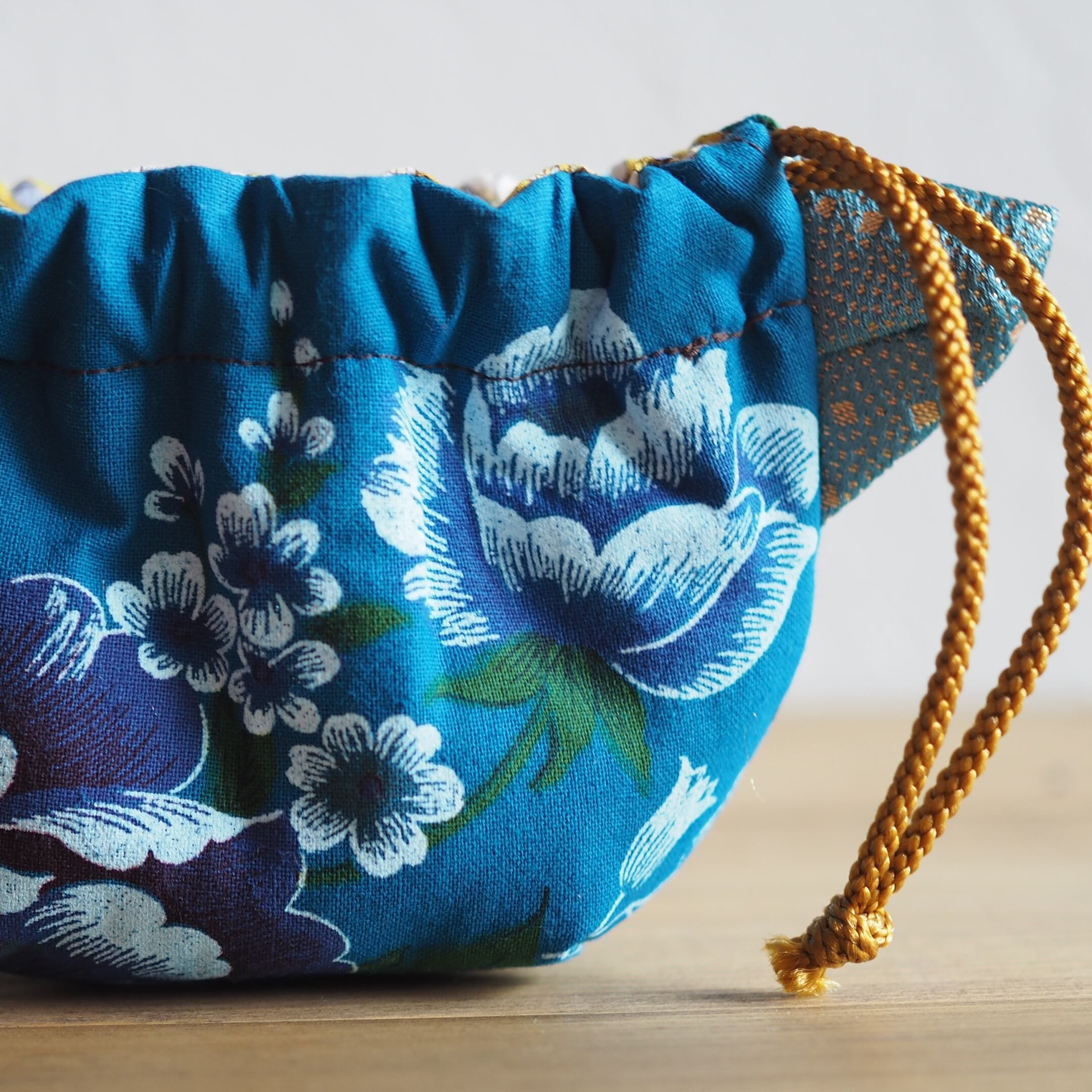 丁度手のひらに収まるミニサイズの巾着ポーチ。みみは本体の花生地に合わせて一番ぴったりな絹織物/金襴織使用、両方キルト芯入り、持ち心地抜群。バッグの中に入れたり、そのままお出かけポーチとして使うのも良いですよ。
