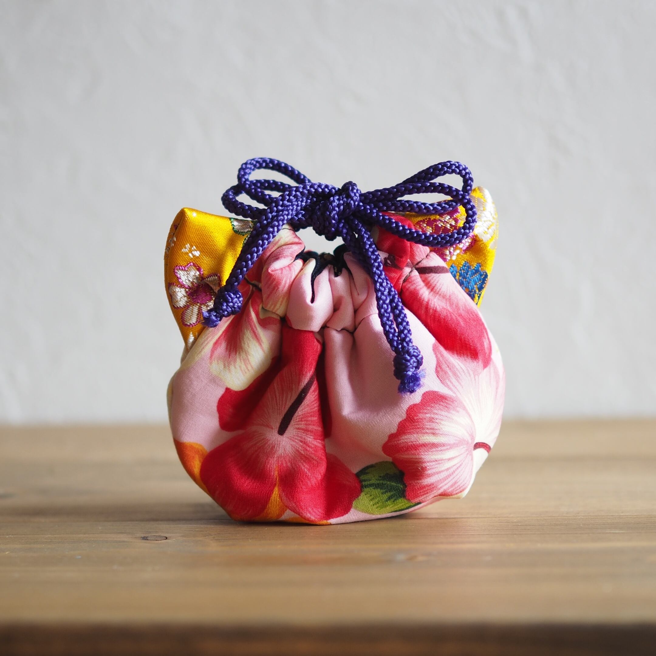 丁度手のひらに収まるミニサイズの巾着ポーチ。みみは本体の花生地に合わせて一番ぴったりな絹織物/金襴織使用、両方キルト芯入り、持ち心地抜群。バッグの中に入れたり、そのままお出かけポーチとして使うのも良いですよ。