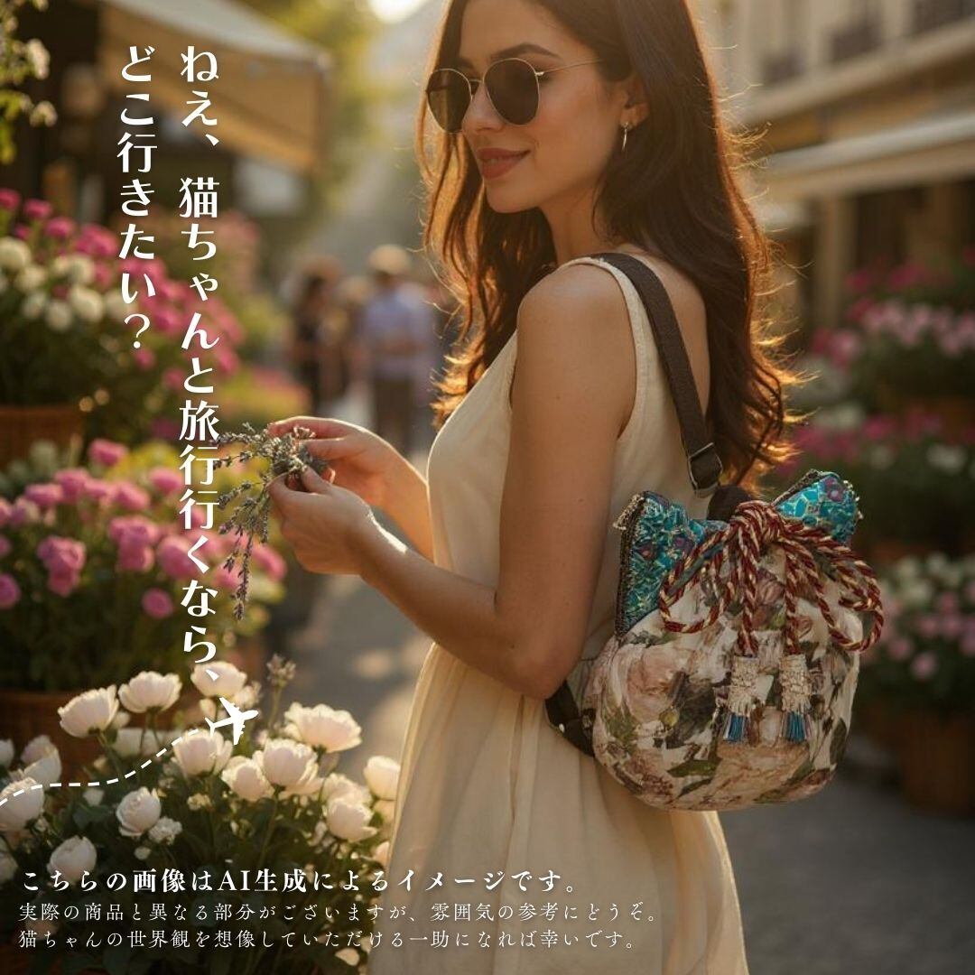 赤・青・ゴールドが織り込まれた絹織物の猫耳が、後ろ姿に華やぎを添えて。