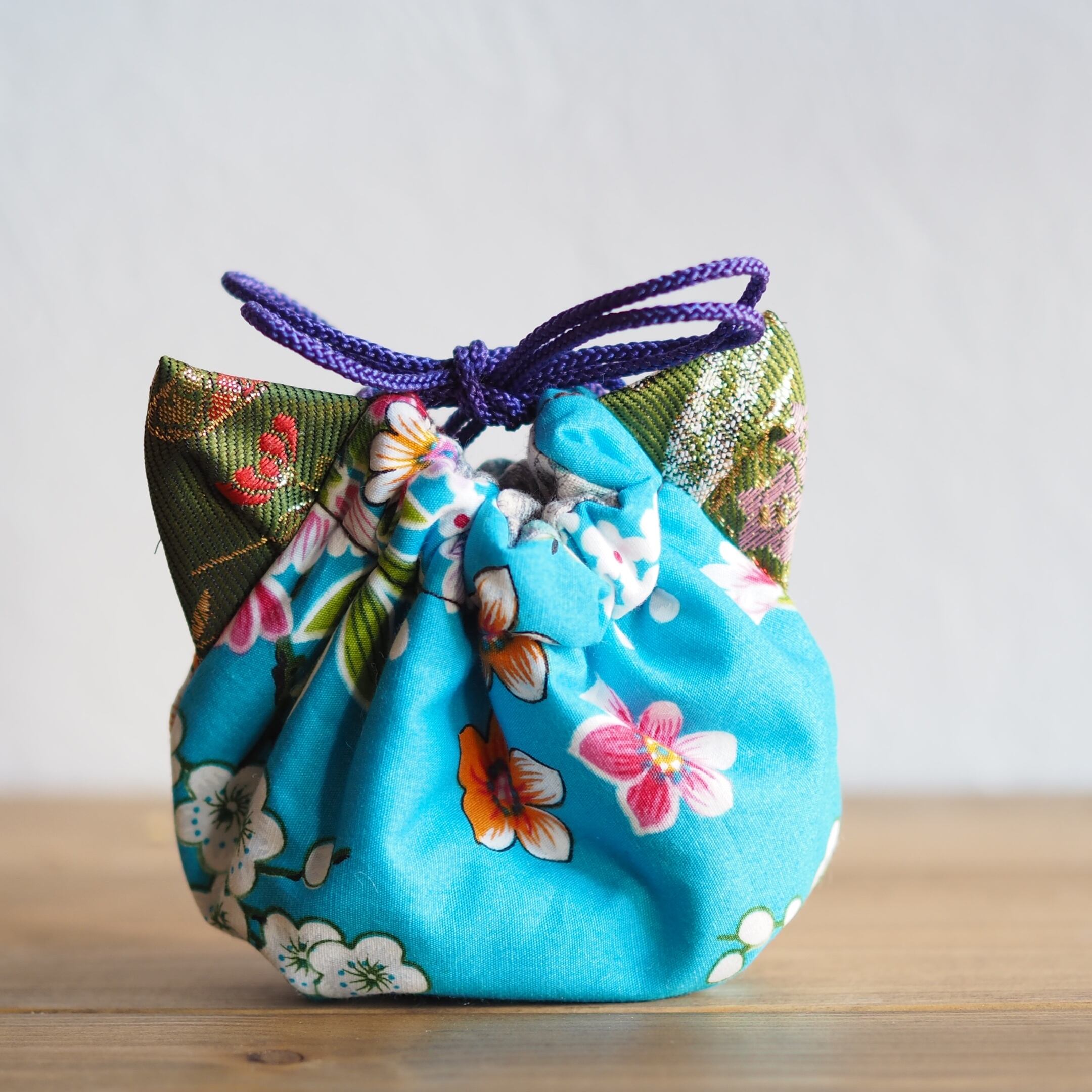 丁度手のひらに収まるミニサイズの巾着ポーチ。みみは本体の花生地に合わせて一番ぴったりな絹織物/金襴織使用、両方キルト芯入り、持ち心地抜群。バッグの中に入れたり、そのままお出かけポーチとして使うのも良いですよ。