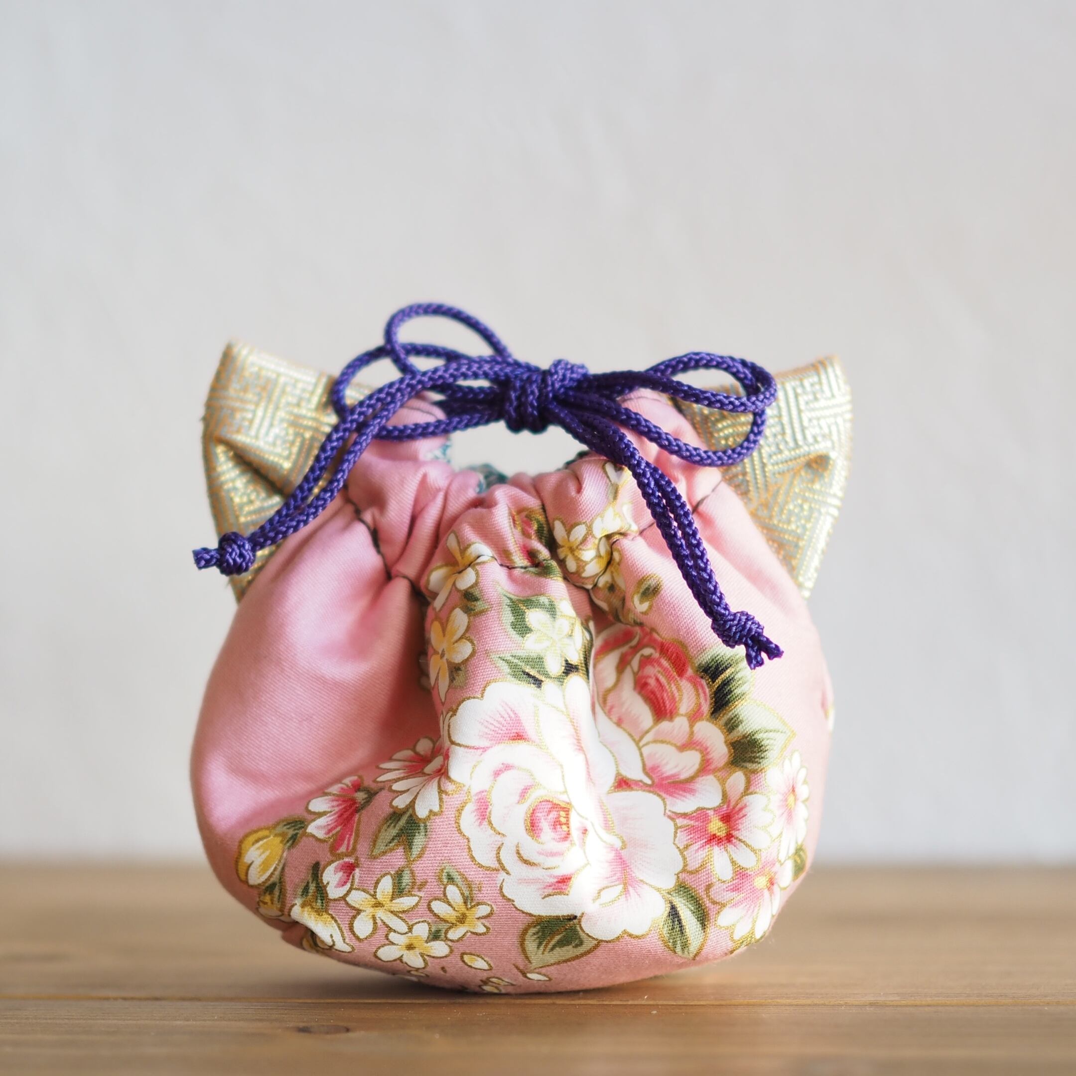 丁度手のひらに収まるミニサイズの巾着ポーチ。みみは本体の花生地に合わせて一番ぴったりな絹織物/金襴織使用、両方キルト芯入り、持ち心地抜群。バッグの中に入れたり、そのままお出かけポーチとして使うのも良いですよ。