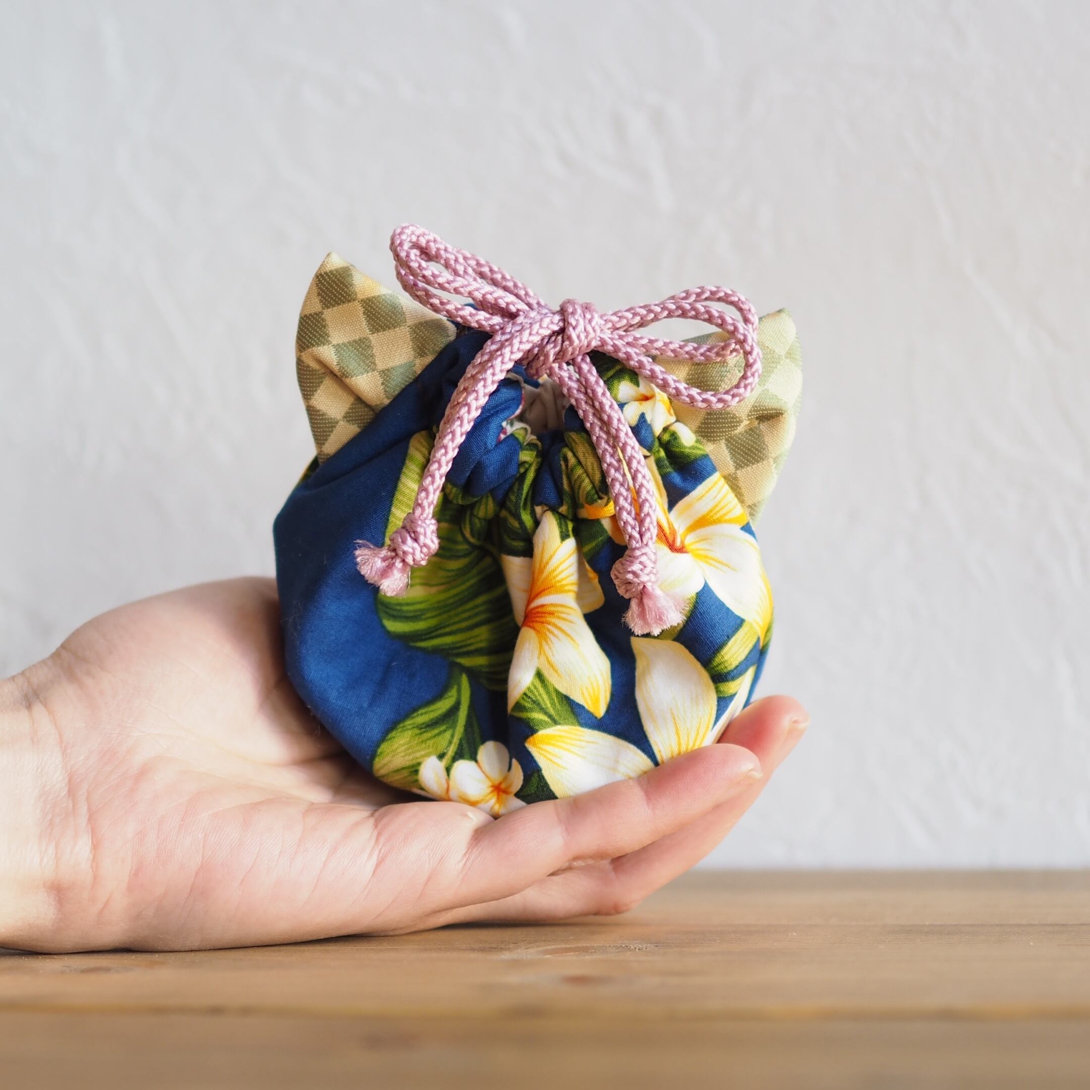 丁度手のひらに収まるミニサイズの巾着ポーチ。みみは本体の花生地に合わせて一番ぴったりな絹織物/金襴織使用、両方キルト芯入り、持ち心地抜群。バッグの中に入れたり、そのままお出かけポーチとして使うのも良いですよ。