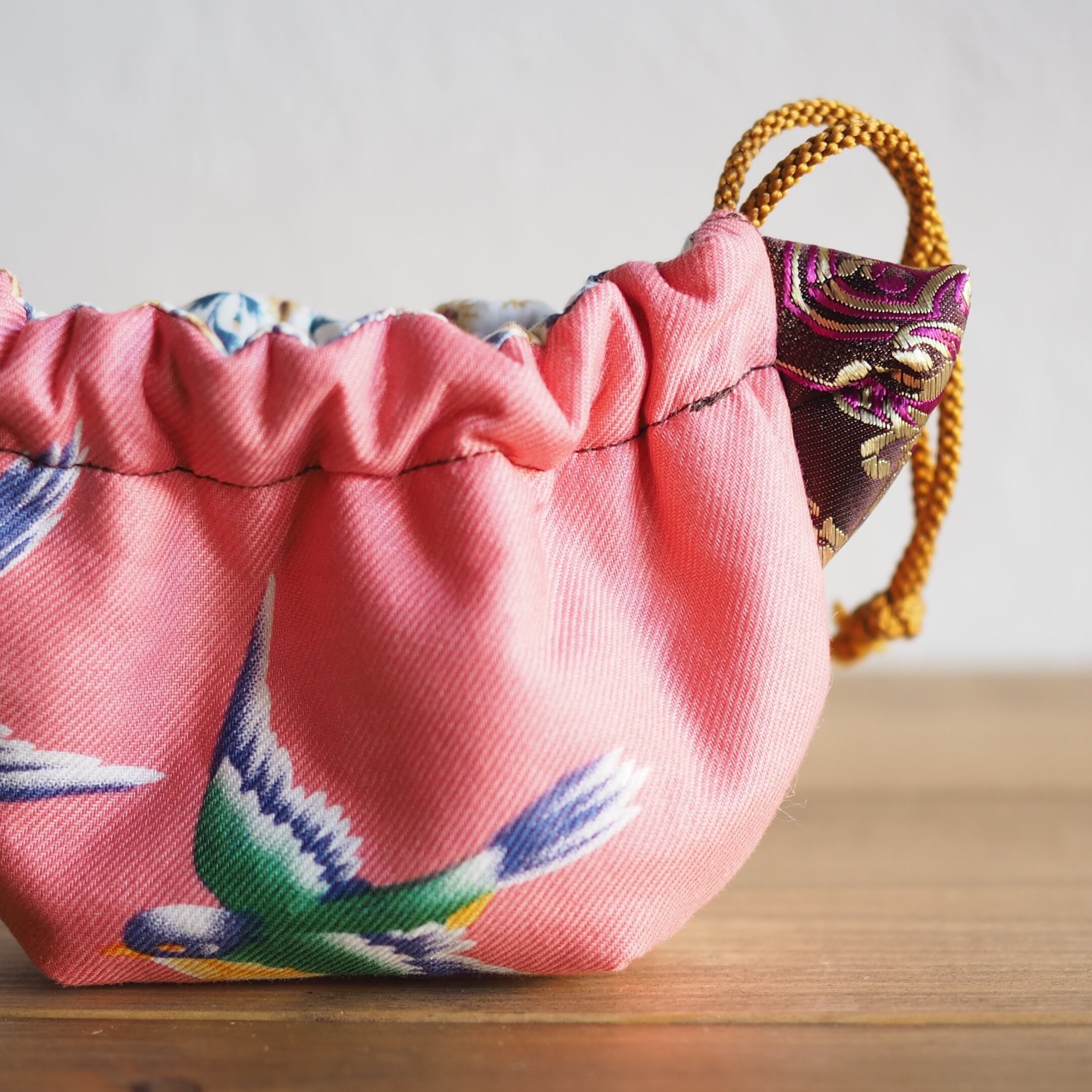 丁度手のひらに収まるミニサイズの巾着ポーチ。みみは本体の花生地に合わせて一番ぴったりな絹織物/金襴織使用、両方キルト芯入り、持ち心地抜群。バッグの中に入れたり、そのままお出かけポーチとして使うのも良いですよ。