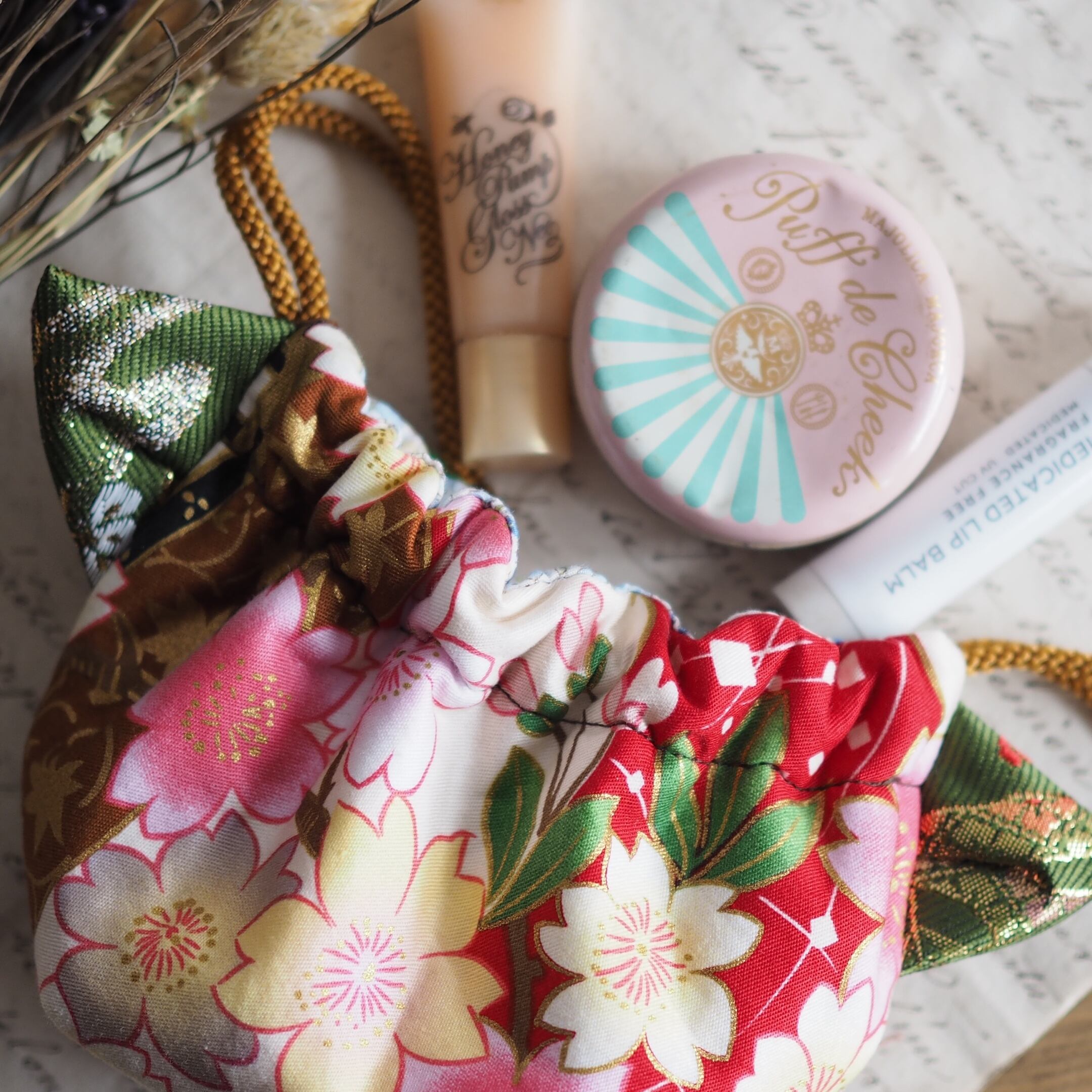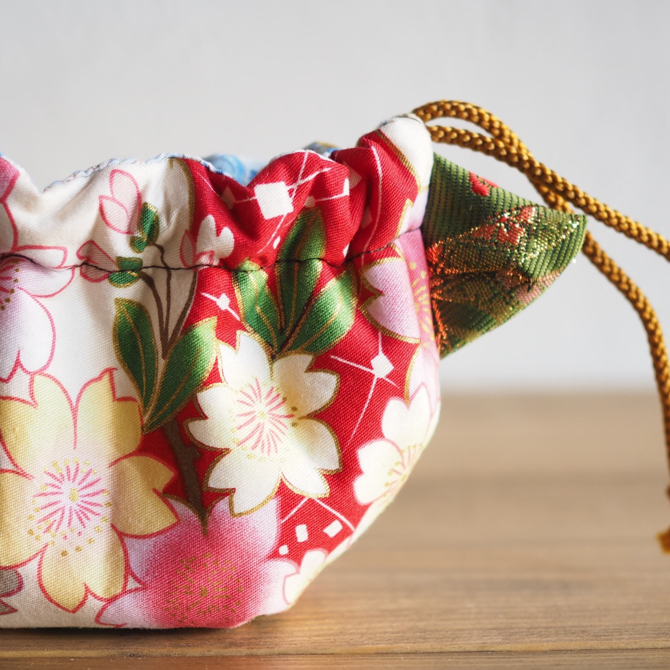 丁度手のひらに収まるミニサイズの巾着ポーチ。みみは本体の花生地に合わせて一番ぴったりな絹織物/金襴織使用、両方キルト芯入り、持ち心地抜群。バッグの中に入れたり、そのままお出かけポーチとして使うのも良いですよ。
