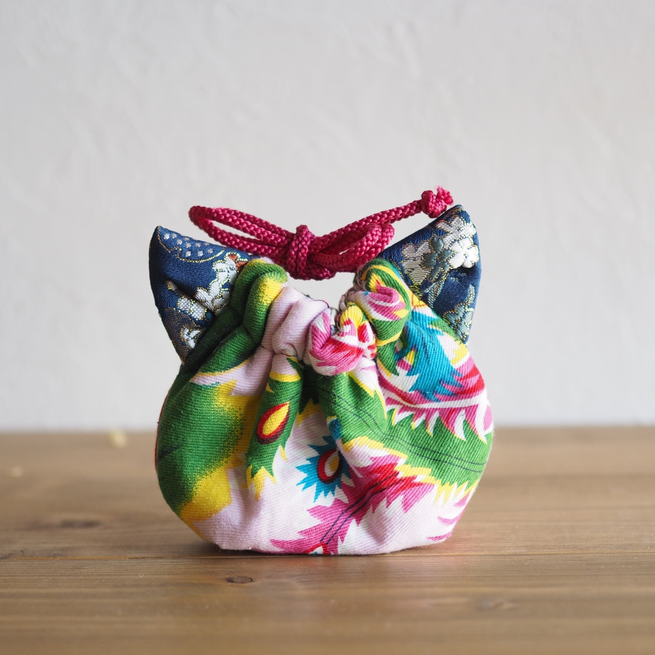 作品名: 猫型の台湾花柄x絹織物mini巾着ポーチ