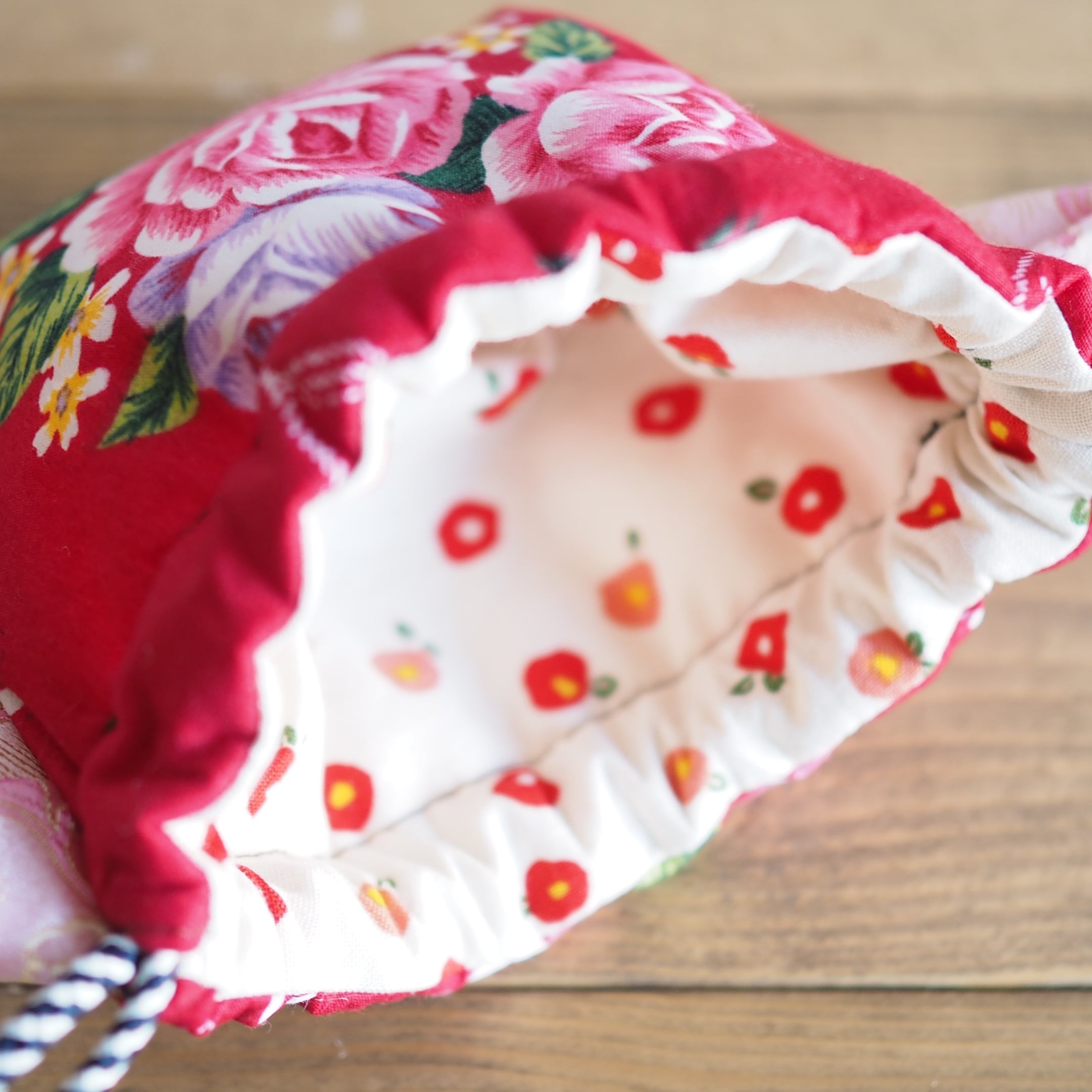 丁度手のひらに収まるミニサイズの巾着ポーチ。みみは本体の花生地に合わせて一番ぴったりな絹織物/金襴織使用、両方キルト芯入り、持ち心地抜群。バッグの中に入れたり、そのままお出かけポーチとして使うのも良いですよ。