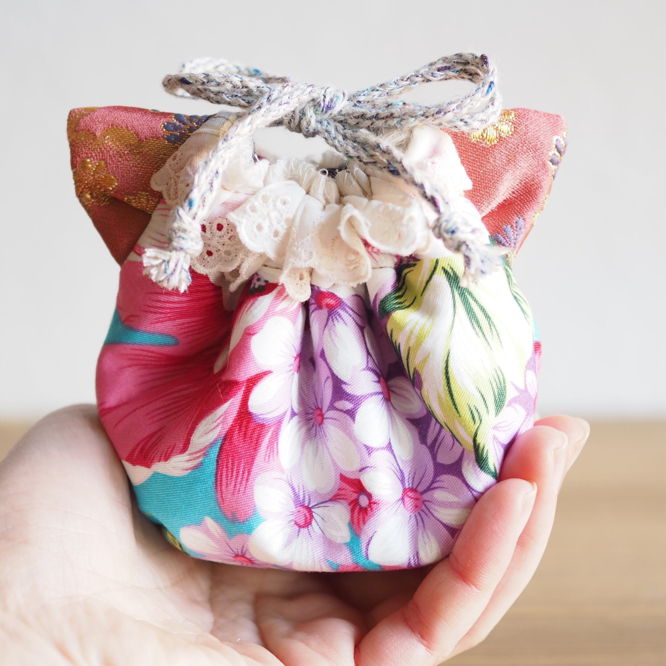 作品名: 春爛漫ふわふわレース台湾花布x絹織物mini巾着ポーチ