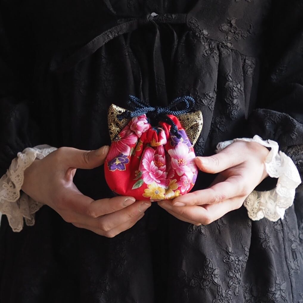 作品名: 猫型の台湾花柄x絹織物mini巾着ポーチ