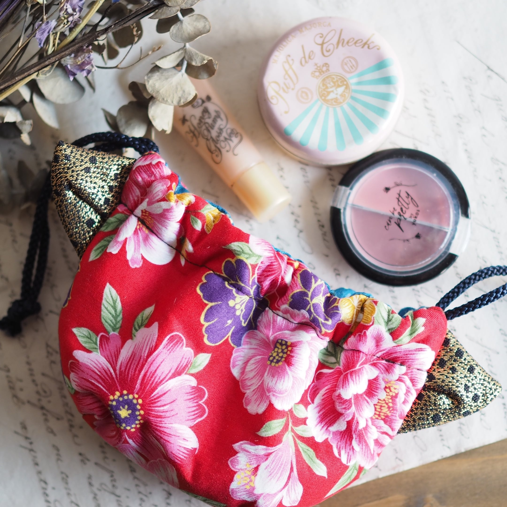 丁度手のひらに収まるミニサイズの巾着ポーチ。みみは本体の花生地に合わせて一番ぴったりな絹織物/金襴織使用、両方キルト芯入り、持ち心地抜群。バッグの中に入れたり、そのままお出かけポーチとして使うのも良いですよ。