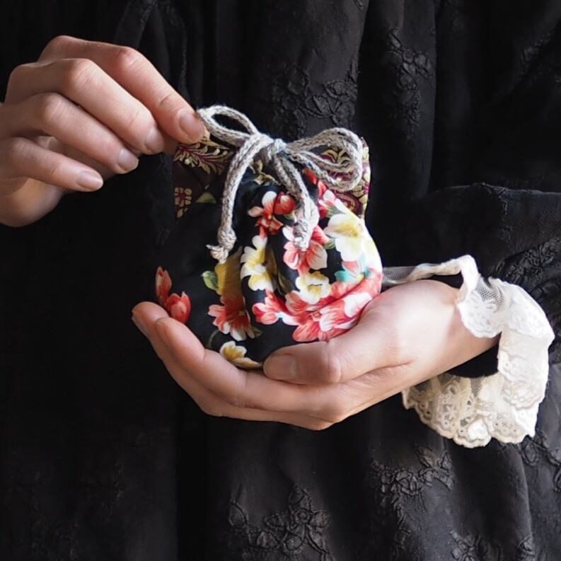 丁度手のひらに収まるミニサイズの巾着ポーチ。みみは本体の花生地に合わせて一番ぴったりな絹織物/金襴織使用、両方キルト芯入り、持ち心地抜群。バッグの中に入れたり、そのままお出かけポーチとして使うのも良いですよ。
