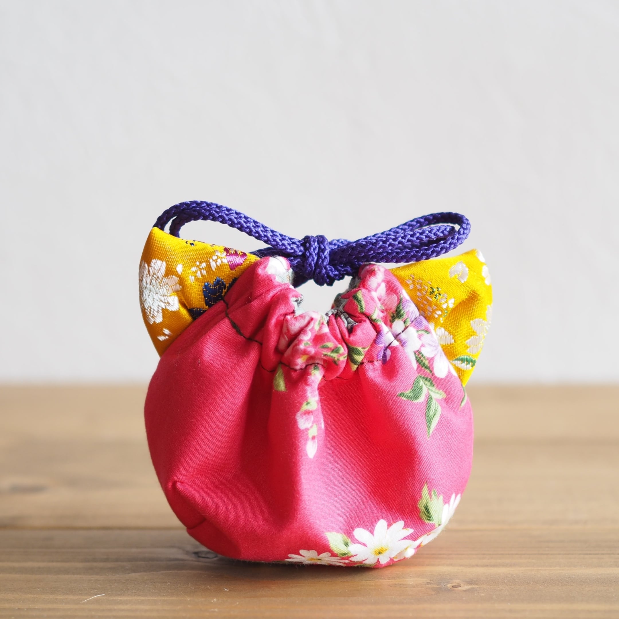 丁度手のひらに収まるミニサイズの巾着ポーチ。みみは本体の花生地に合わせて一番ぴったりな絹織物/金襴織使用、両方キルト芯入り、持ち心地抜群。バッグの中に入れたり、そのままお出かけポーチとして使うのも良いですよ。