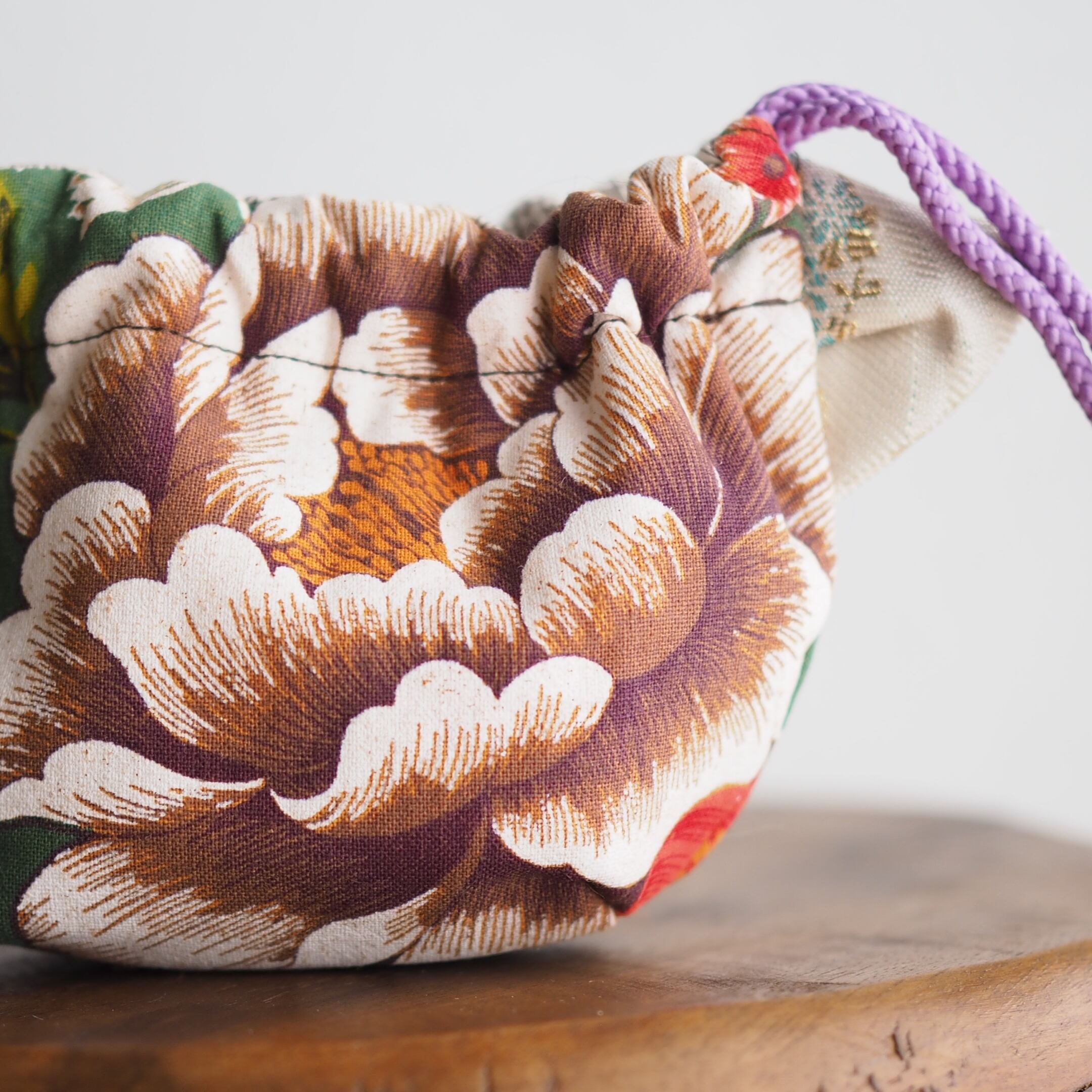 丁度手のひらに収まるミニサイズの巾着ポーチ。みみは本体の花生地に合わせて一番ぴったりな絹織物/金襴織使用、両方キルト芯入り、持ち心地抜群。バッグの中に入れたり、そのままお出かけポーチとして使うのも良いですよ。