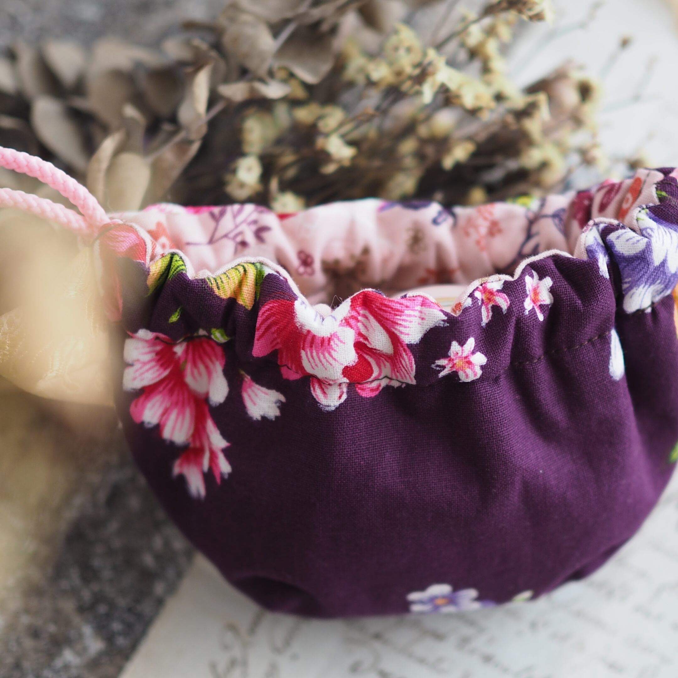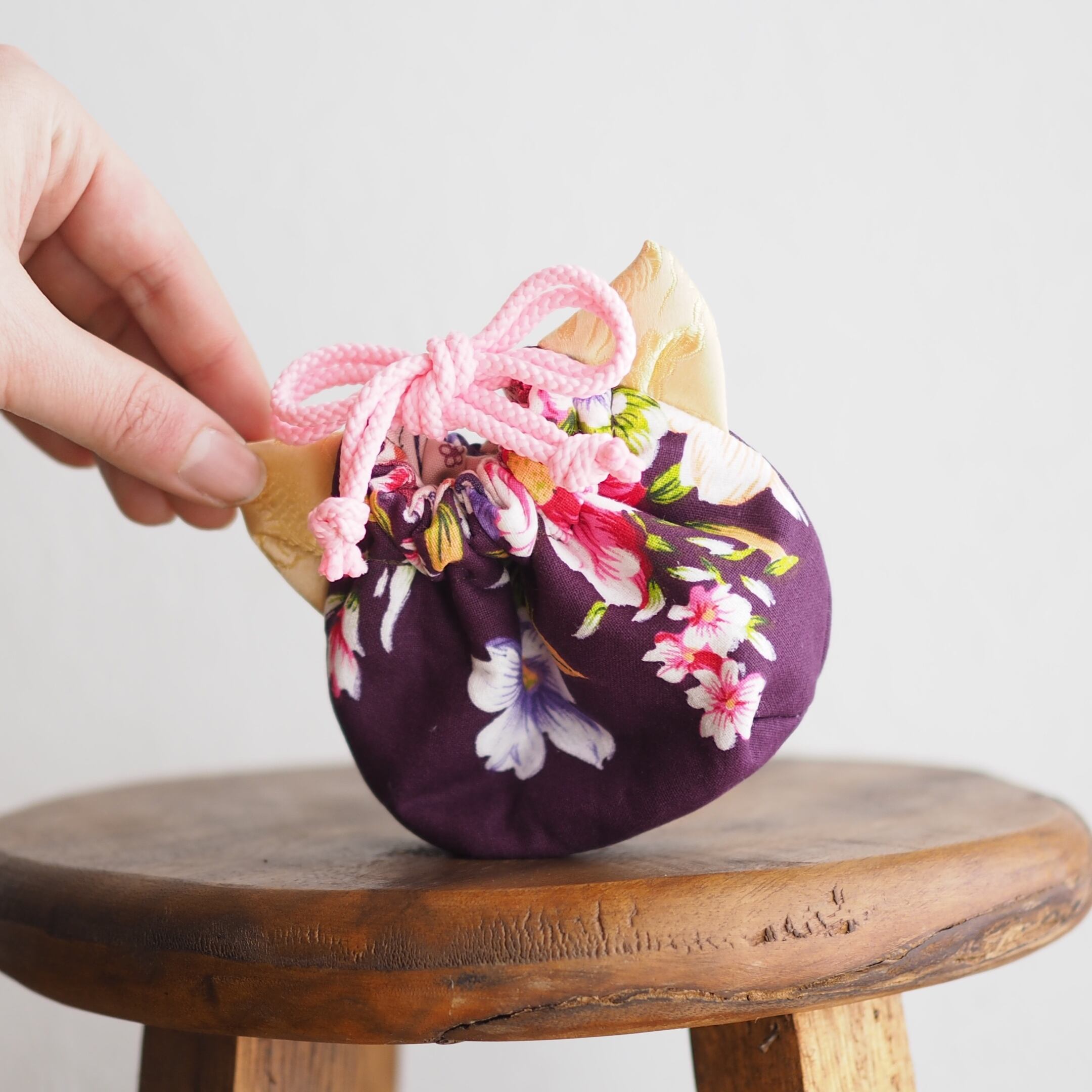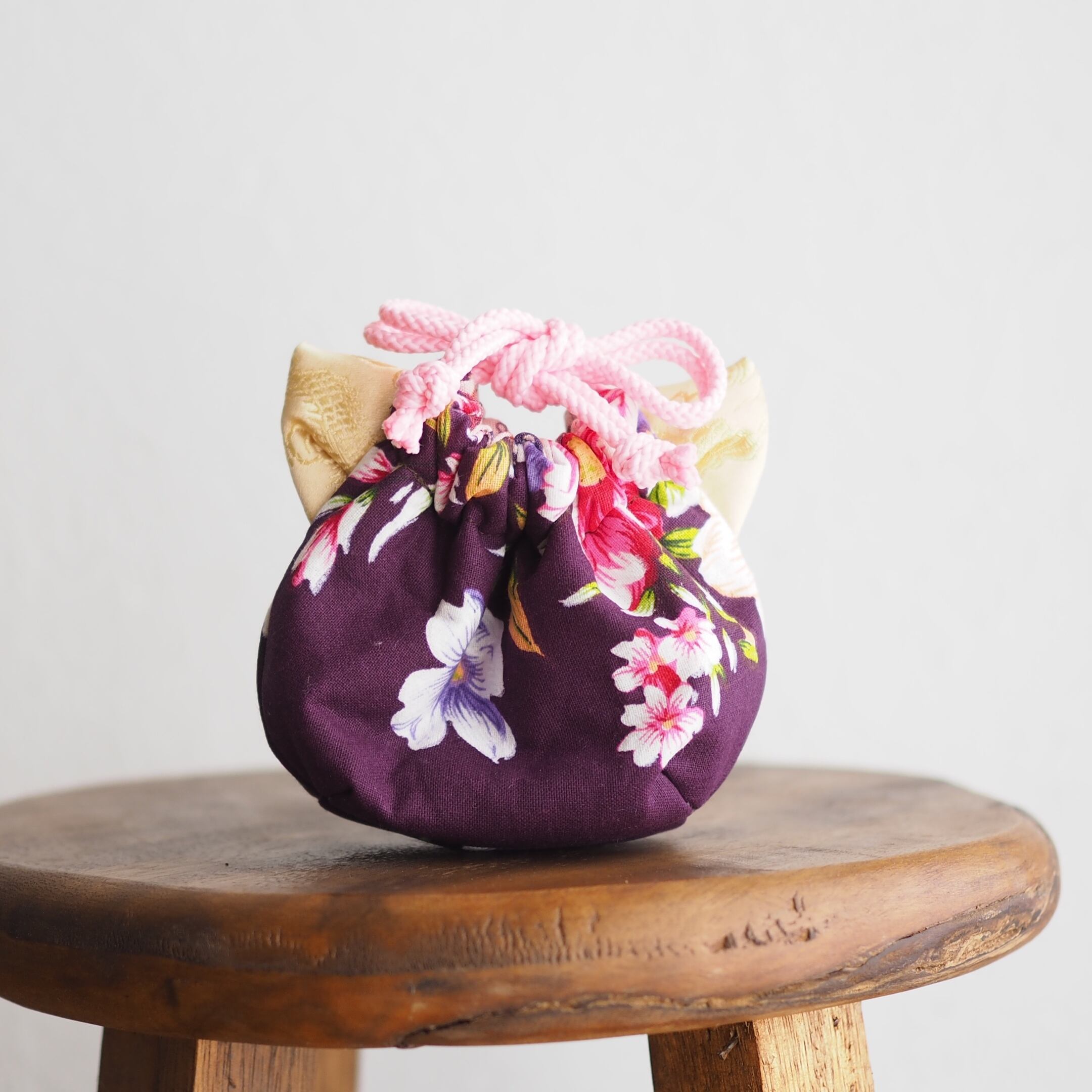 丁度手のひらに収まるミニサイズの巾着ポーチ。みみは本体の花生地に合わせて一番ぴったりな絹織物/金襴織使用、両方キルト芯入り、持ち心地抜群。バッグの中に入れたり、そのままお出かけポーチとして使うのも良いですよ。