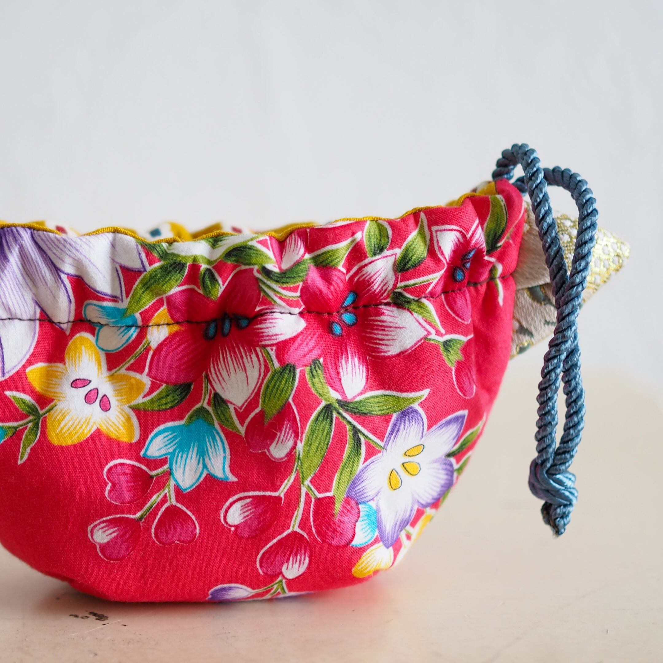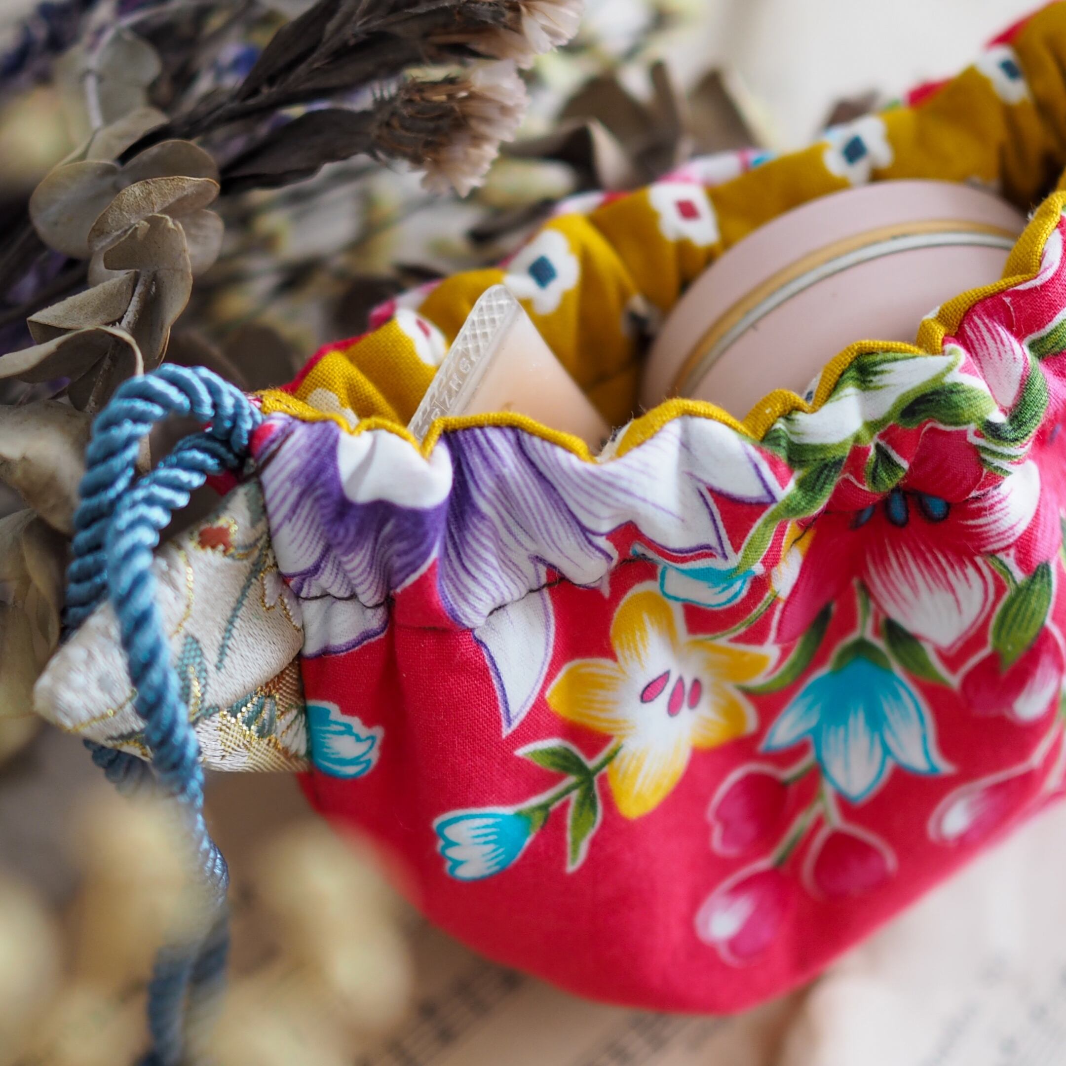 丁度手のひらに収まるミニサイズの巾着ポーチ。みみは本体の花生地に合わせて一番ぴったりな絹織物/金襴織使用、両方キルト芯入り、持ち心地抜群。バッグの中に入れたり、そのままお出かけポーチとして使うのも良いですよ。