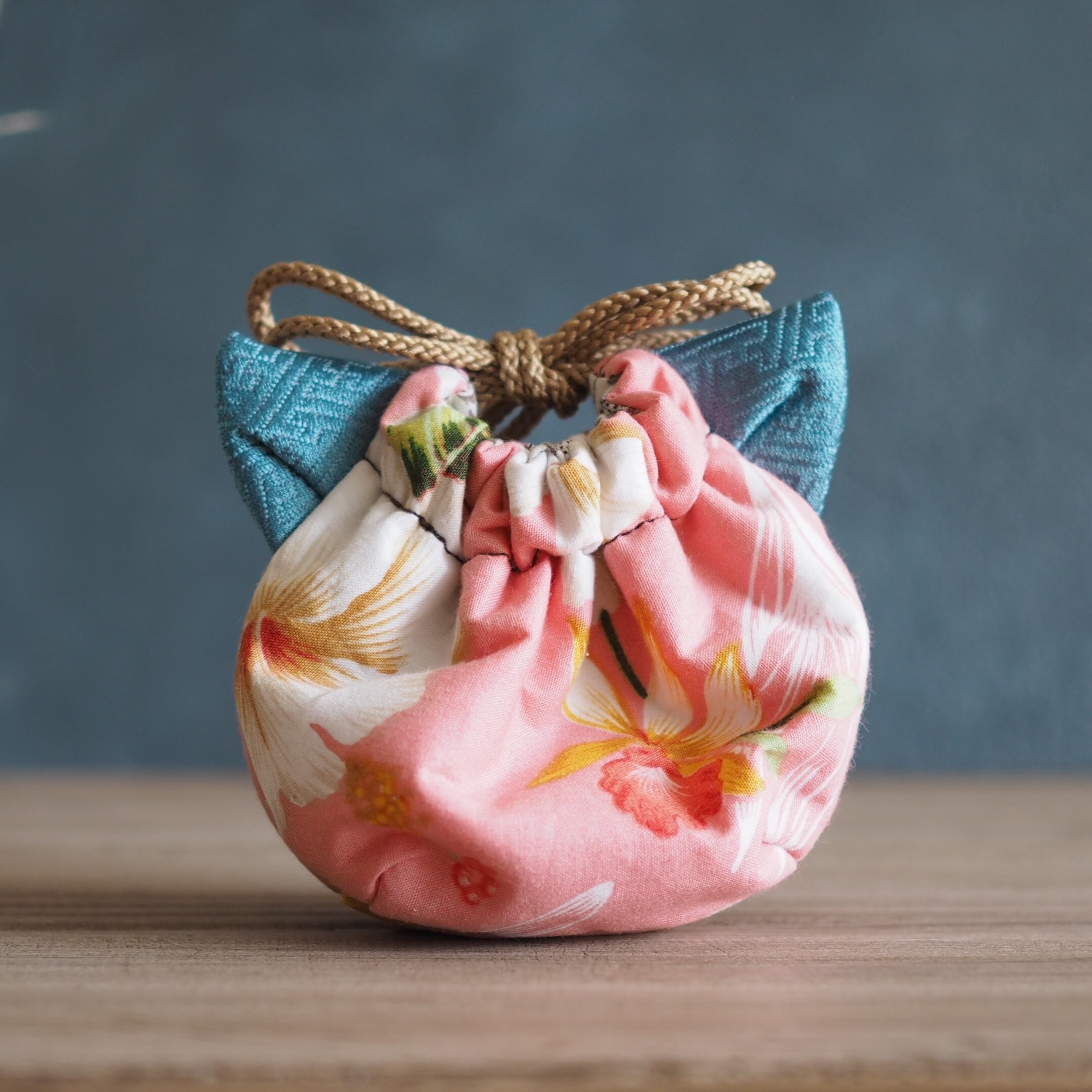 作品名: 猫型の台湾花柄x絹織物mini巾着ポーチ